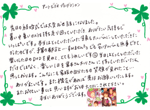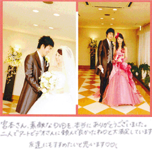 当日は大変お世話になったにも関わらず お礼の返事遅れましてすいません。慣れないドレスを着て 体調があまりすぐれなかった披露宴でしたが、DVDであらためて見て、 当日の状況や友人たちのメッセージ、私や恩師の演奏を楽しく 振り返ることができました。もう何度も繰り返してみています。 友人の結婚式ビデオ撮影の際には絶対アートビデオプロダクションを薦めします。 感謝の気持ちでいっぱいです。本当に有難うございました。