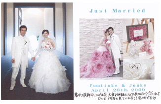 私の大好きなコブクロの曲でダイジェストを作って頂きありがとうございました。 式をあげるよりも先に娘が生まれた私にとって、待望の結婚式は考え深いものがありました。 しかも私の友人たちが早くDVDを見たいということで無理を言ったにもかかわらず、 快く引き受けて頂きありがとうございます。 おかげさまで、ビデオ上映は友人達と大盛り上がりで時間も20分ぐらいでテンポがよかったです。 私達だけでなく娘の美奈や両親、そして友人達のコメントも見れてDVDの仕上がりに大変満足しています。 式当日に初めてお会いしましたが、とても誠実さが伝わってきました。 これからもたくさんのカップルに感動をお届け下さい。