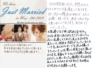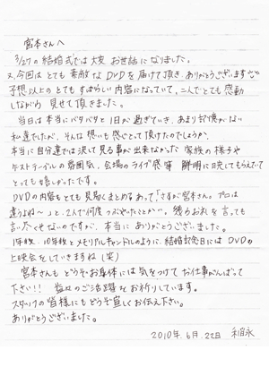 こんにちわ。おひさしぶりです。先日はありがとうございました。 届いたDVD早速見ましたよ。結婚式当日は衣装替えを何回もしたし、 ライトがすごくまぶしくて会場がよく見えなかったりで知らないことばっかりだったので、 DVDを見て初めて気付く事がたくさんありました。撮影をお願いして本当に良かったって思いました。 友人や家族からも大絶賛でしたよ☆ -