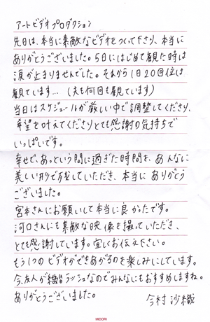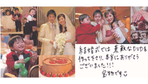 今日ビデオが届きました!ビデオすごく素敵で感動しました。 とてもびっくりしています。本当にすばらしい物を作っていただ きありがとうございました。時々見ては感動し、一生大事にしていきたいと思います。 本当に感謝しております。ありがとうございました^^ -