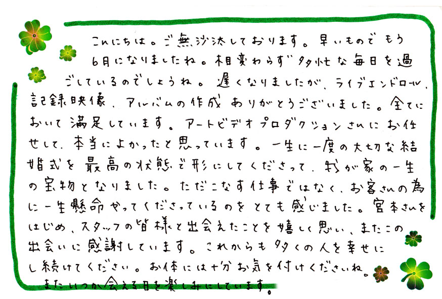 こんにちは。ご無沙汰しております。早いものでもう6月になりましたね。 相変わらず多忙な毎日を過ごしているのでしょうね。遅くなりましたが、ライブエンドロール、記録映像、アルバムの作成ありがとうございました。全てにおいて満足しています。 アートビデオプロダクションさんにお任せして、本当によかったと思います。一生に一度の大切な結婚式を最高の状態で形にしてくださって、我が家の一生の宝物になりました。 ただこなす仕事ではなく、お客さんの為に一生懸命やってくださっているのをとても感じました。スタッフの皆様と出会えたことを嬉しく思い、またこの出会いに感謝しております。 これからも多くの人を幸せにし続けて下さい。お体には十分お気を付けて下さいね。またいつか会える日を楽しみにしています。 -